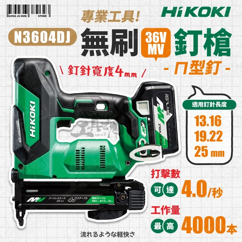 查看更多HiKOKI- N3604DJ MV36V 無刷ㄇ型釘槍 無刷釘槍機 無刷 釘槍 型釘 日立