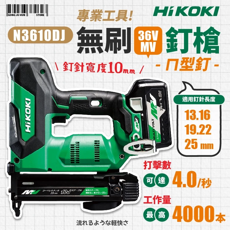 查看更多HiKOKI- N3610DJ MV36V 無刷ㄇ型釘槍 無刷釘槍機 無刷 釘槍 型釘 日立