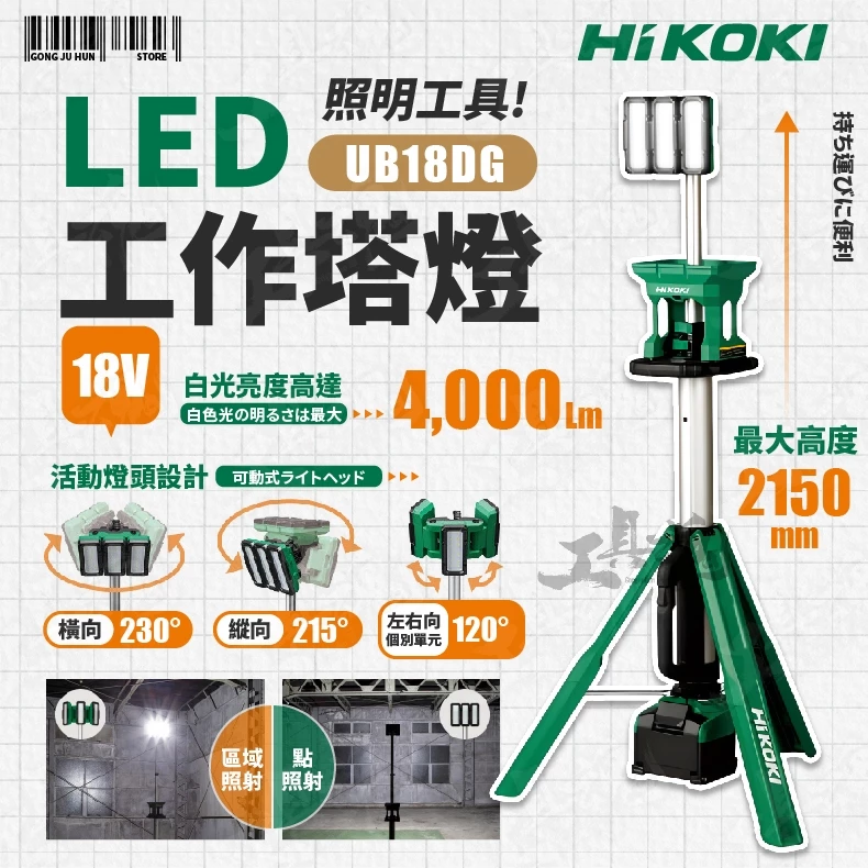 HIKOKI- LED工作燈 UB18DG 18V 工作塔燈 4000lm 活動燈頭 照明燈 空機