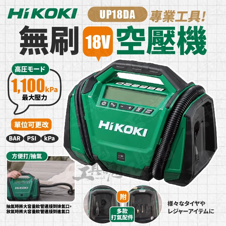 HIKOKI- 18V 空壓機 UP18DA 無刷 1100kPa 可改單位 LED燈 便攜 輕巧