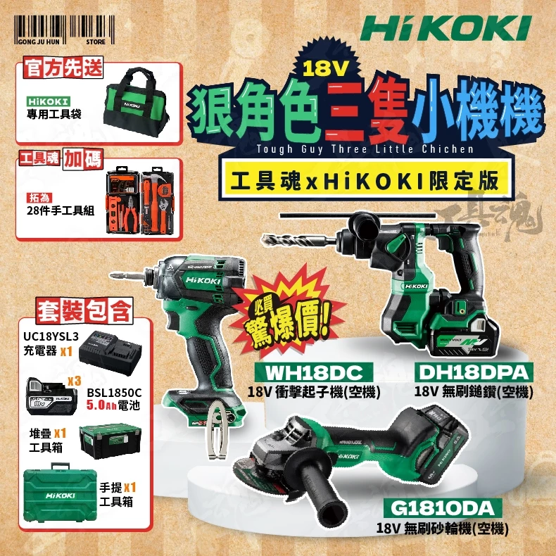 查看更多HIKOKI- 最強版 三機組 新版電池 衝擊起子機 鎚鑽 砂輪機 WH36DC DH18DBL G