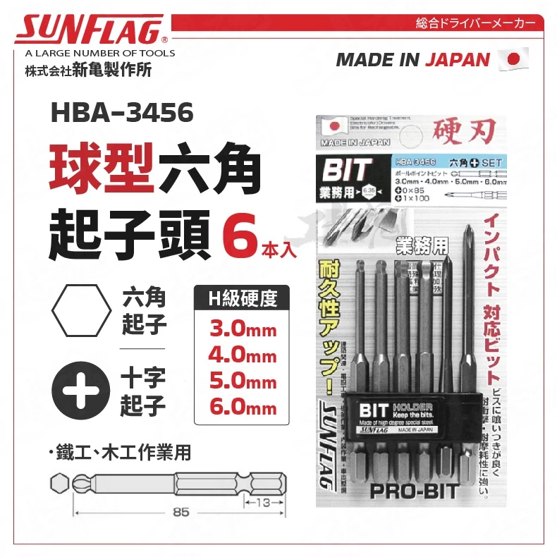 新龜/SUNFLAG- 球型六角起子頭 6入 HBA-3456 十字 球型六角 日本製 帶磁性起子