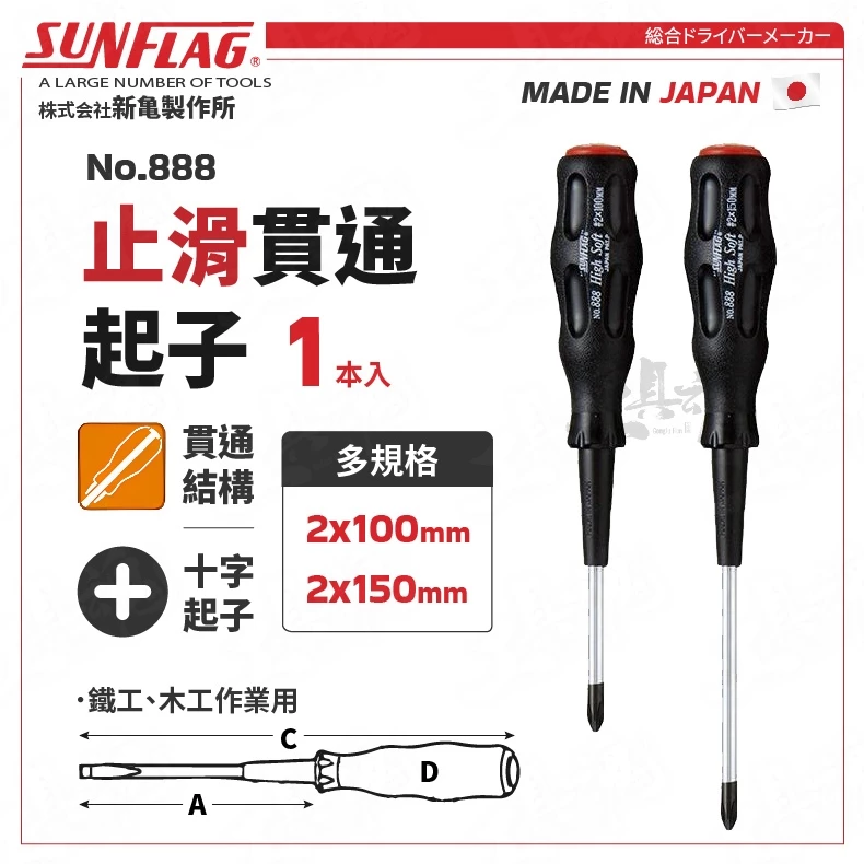 新龜/SUNFLAG- 止滑貫通起子 No.888 十字起子 2x100mm 2x150mm 日本製