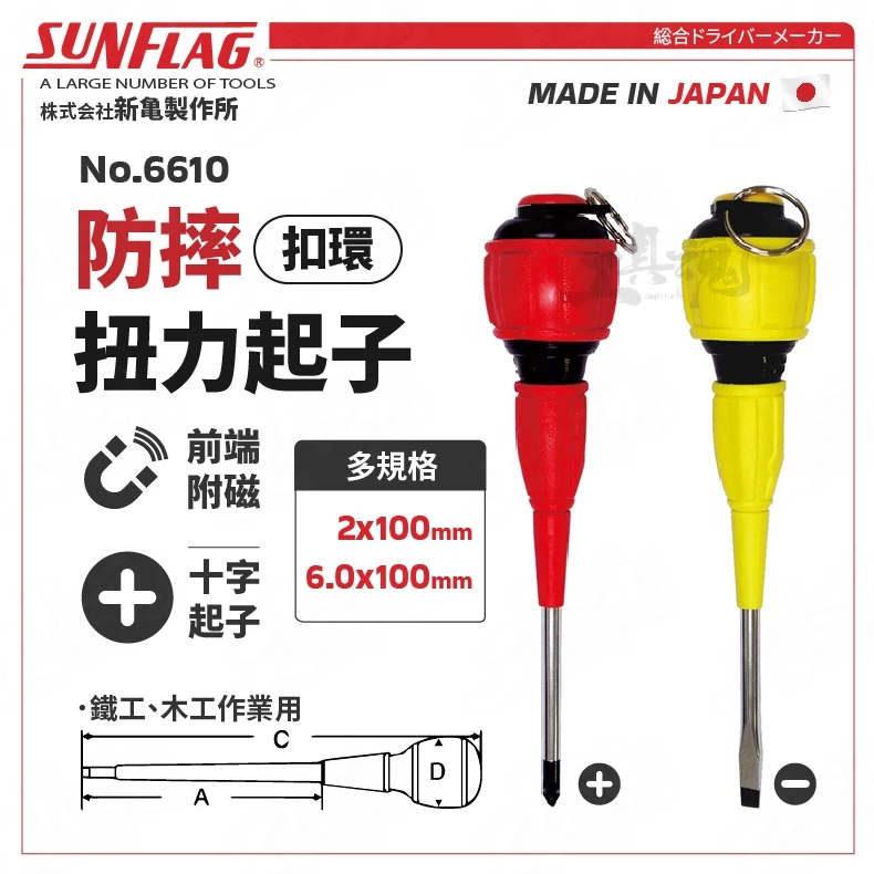 新龜- 防摔扭力起子 No.6610 十字起子 2x100mm 6x100mm 扣環 日本製 可磁吸