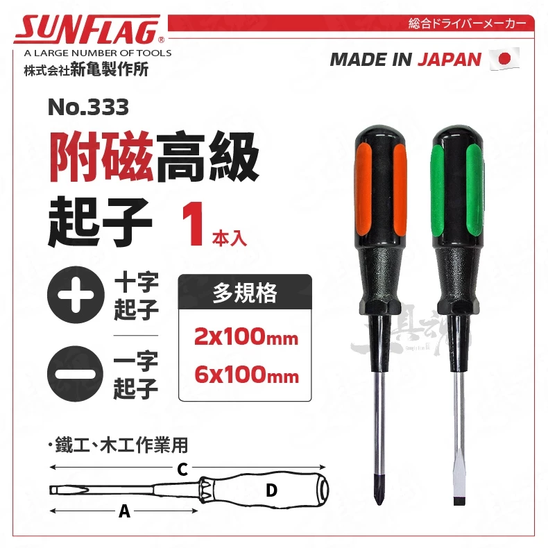 新龜/SUNFLAG- No.333 附磁高級起子 十字 一字 2x100mm 6x100mm 日本