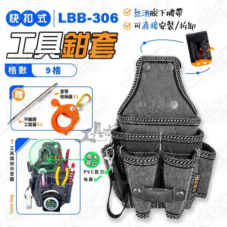 查看更多BIGBAGN- 快扣式 LBB306 九格工具鉗套 工具袋 306 工具包 工作包 電工工具袋 工