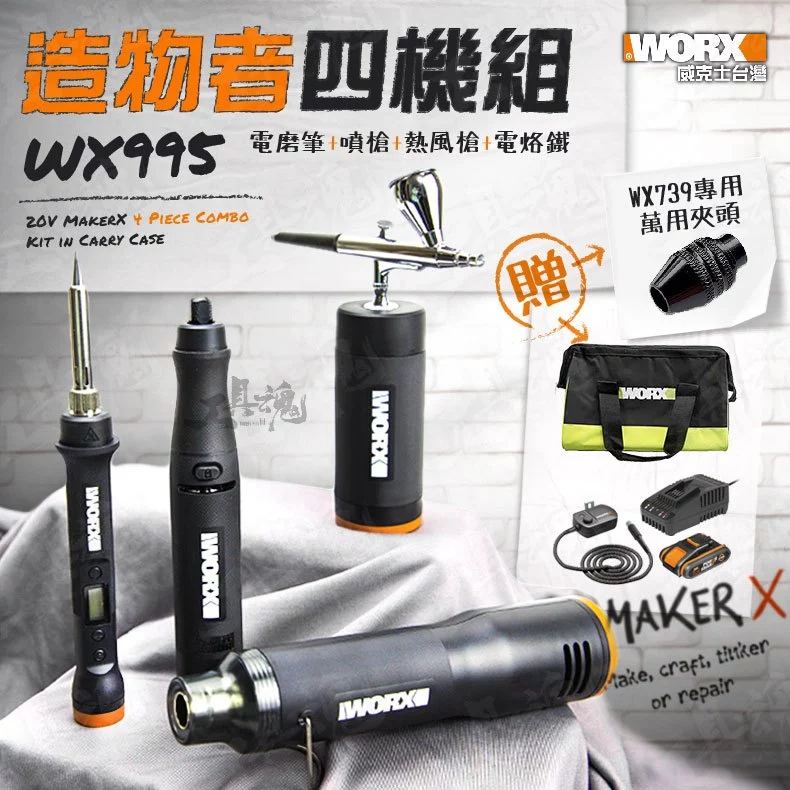 威克士- 【免運】 WX995 造物者四機組 makerX 電磨筆 迷你噴槍 熱風槍 電烙鐵 20V