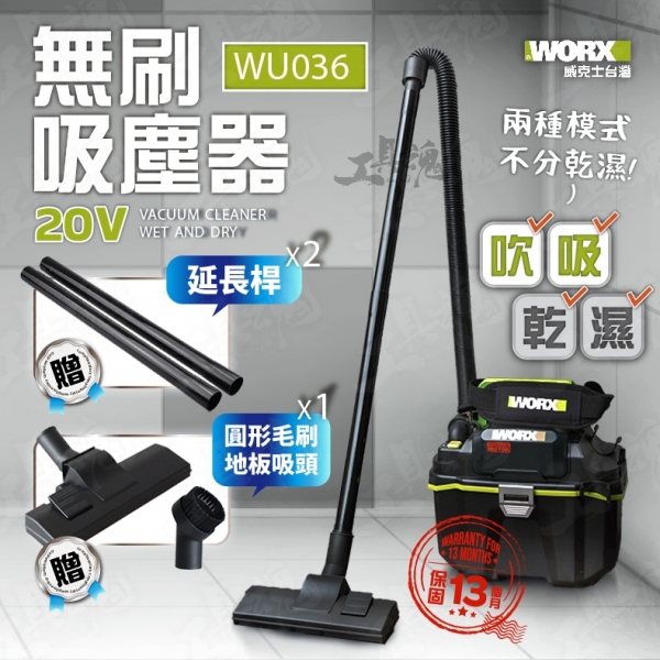 威克士- WU036 無刷吸塵器 乾濕兩用 附贈延長桿 地板吸頭 圓形毛刷 威克士 WORX WU0