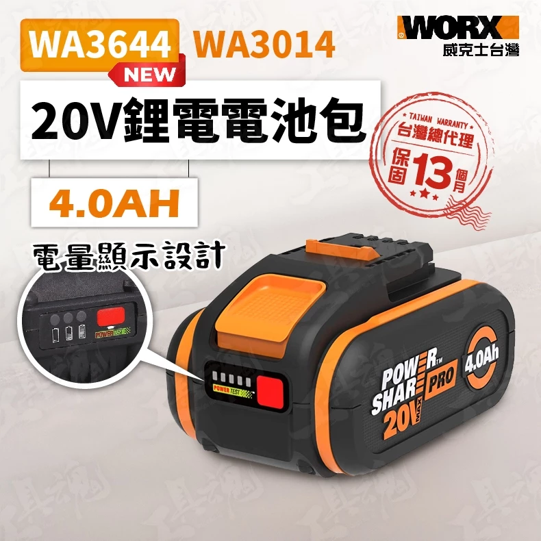 威克士- 全新版本!WA3014 威克士 4.0AH 電池包 20V 鋰電池 橘標 橘色 電池 公司