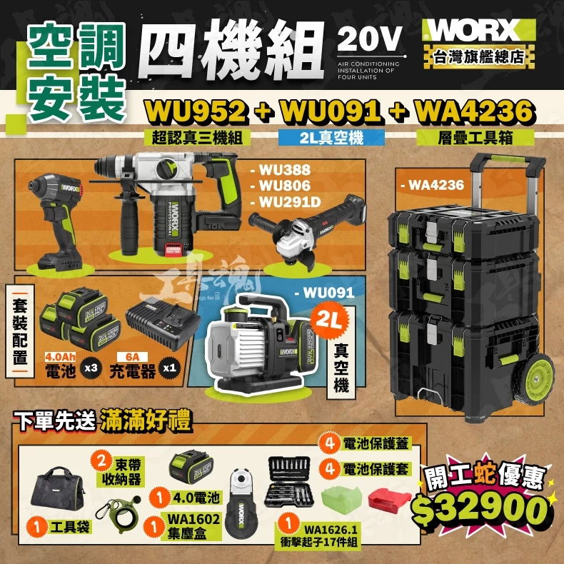 查看更多威克士- 空調安裝四機組 WU388 WU291D WU806 WU091 WA4235 堆疊工具箱