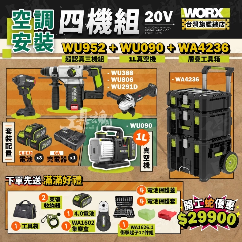 查看更多威克士- 空調安裝四機組 WU388 WU291D WU806 WU090 WA4235 堆疊工具箱