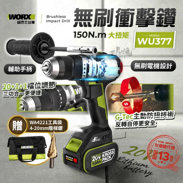 威克士- WU377 無刷衝擊鑽 衝擊鑽 150牛頓米 大扭矩 WORX WU377.1 威克士 公