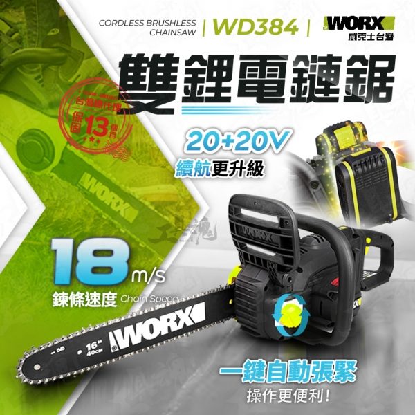 威克士- WD384 雙鋰電鏈鋸 鏈鋸 鏈鋸機 無刷電機 40V 20V WORX 園藝用 電鋸