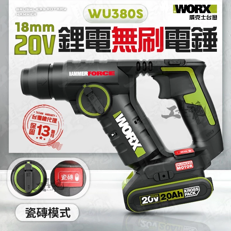 威克士- WU380S 磁磚模式 4.0AH 18MM 電錘 錘鑽 鎚鑽 無刷 無碳 20V 公司