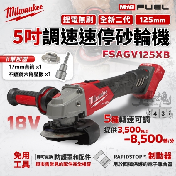 升級二代 M18 FSAGV125XB 美沃奇- 速停砂輪機 18V 鋰電無刷 5吋 調速砂輪機 砂
