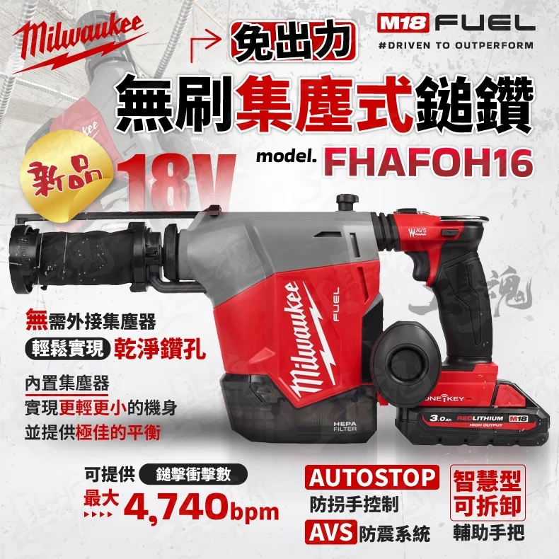 美沃奇- 新品 M18 FHAFOH16 18V 無碳刷 免出力 集塵式 鎚鑽 米沃奇 M18FHA
