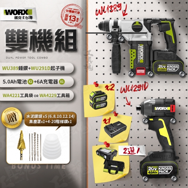 威克士- 超認真雙機組 WU389+WU291D 5.0Ah電池 2機組 起子機 錘鑽組 20V W