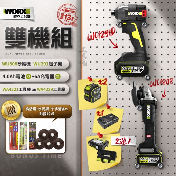 威克士- 超認真雙機組 WU808+WU291D 4.0Ah電池 2機組 起子機 砂輪機組 20V