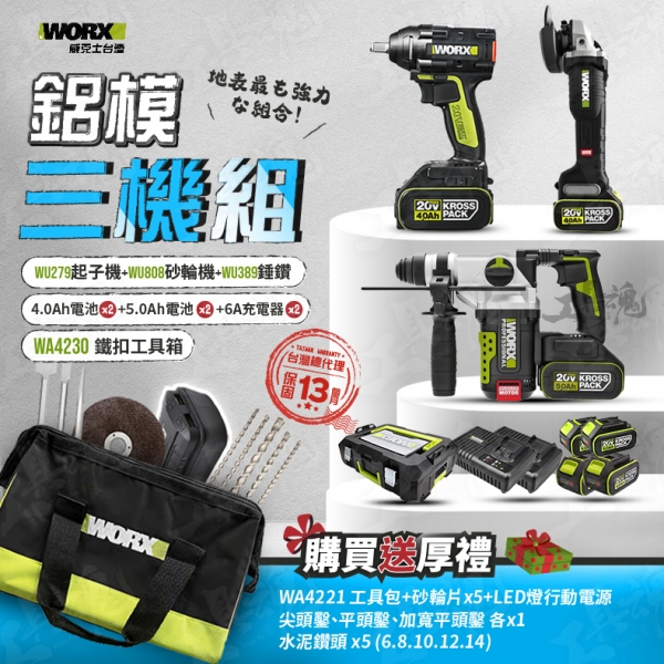 威克士- 鋁模三機組 3機組 WU279起子機 WU808砂輪機 WU389錘鑽 WA4230 WO