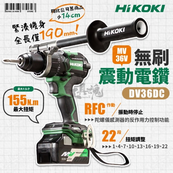 HIKOKI - 震動電鑽 155Nm DV36DC 36V 鋼頭 無刷 雙電池 充電 電鑽