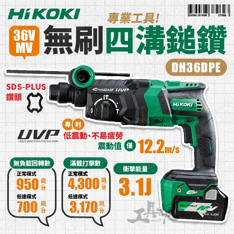 查看更多HIKOKI- 無刷四溝鎚鑽 DH36DPE SDS MV 36V 電鎚 鎚鑽 dh36dpe hi