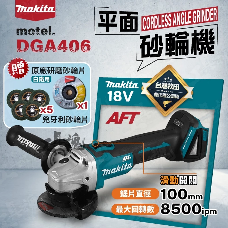 牧田- 18V DGA406 平面砂輪機 鋰電無刷 砂輪機 磨切機 角磨機 TS認證 8500轉 牧