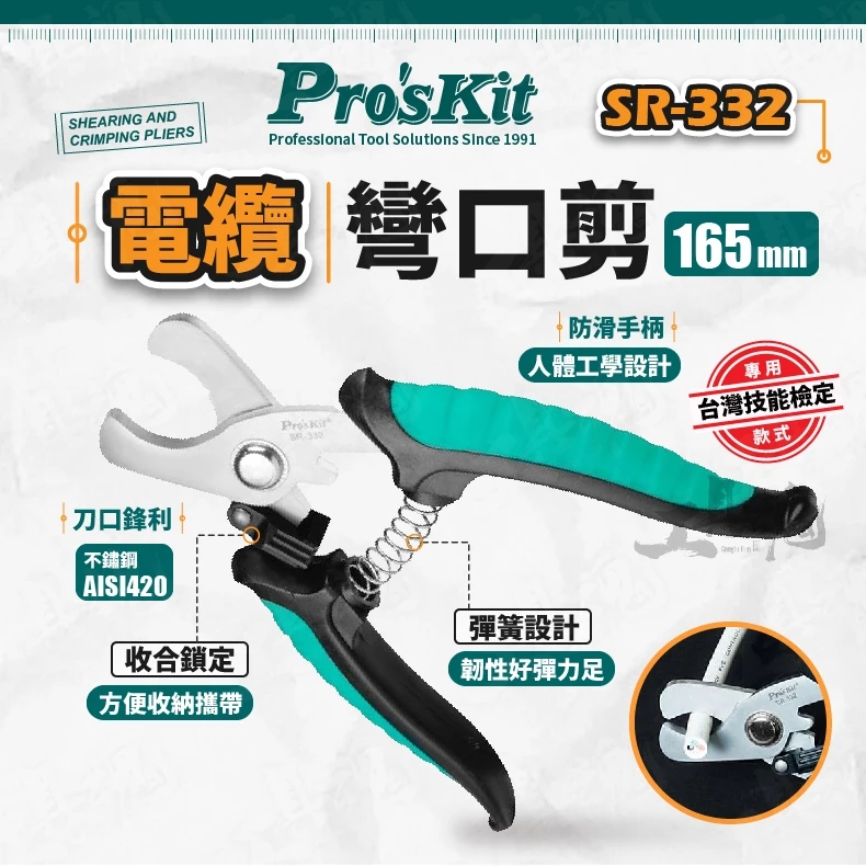 寶工- SR-332 電纜彎口剪 165mm 電纜剪 ProsKit 不鏽鋼精密沖壓 防滑 彎口剪