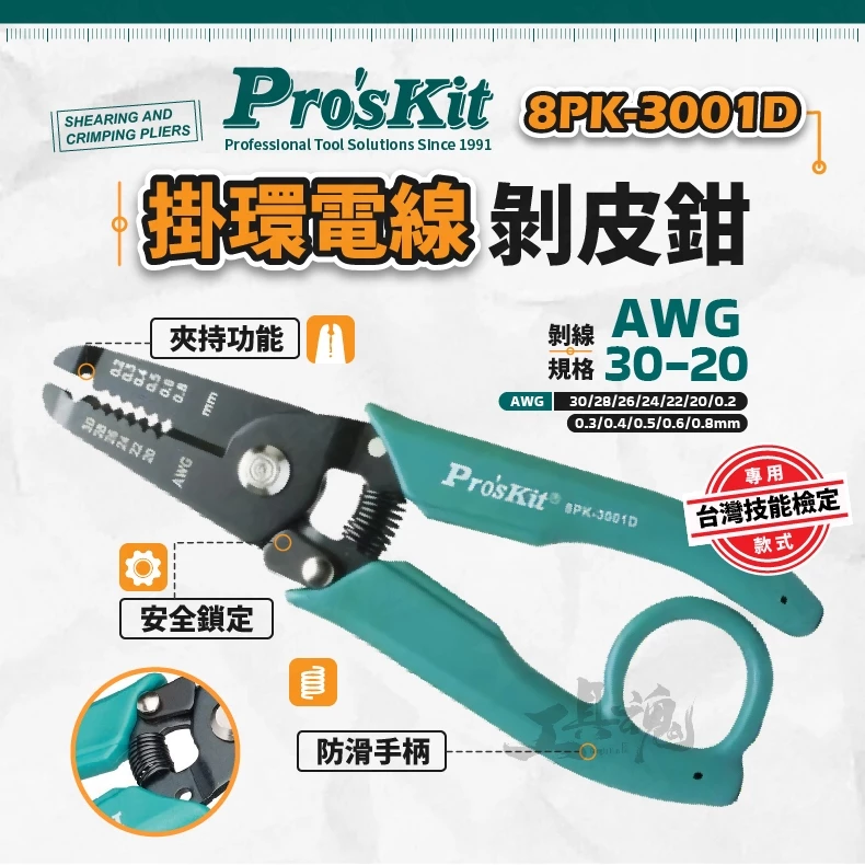 寶工- 8PK-3001D 掛環電線剝皮鉗 Pro'sKit 台灣技能檢定專用款 快速 鉗子 電纜剪