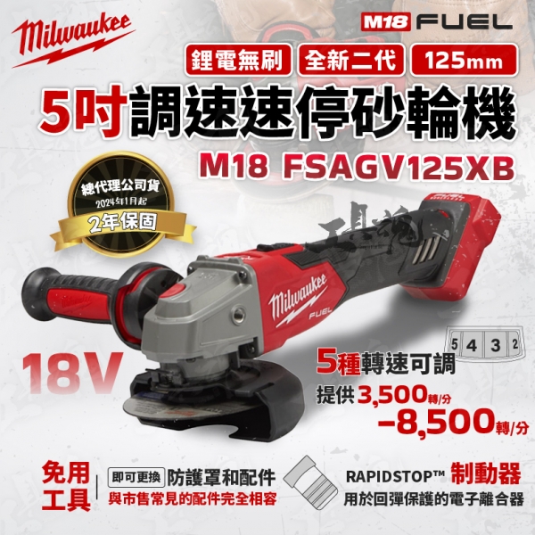美沃奇-升級二代 M18 FSAGV125XB 調速速停砂輪機 18V 無刷 5吋 調速砂輪機 砂輪