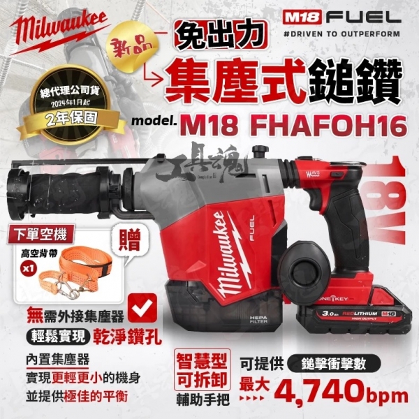美沃奇- 新品 M18 FHAFOH16 18V 無碳刷 免出力 集塵式 鎚鑽 米沃奇 M18FHA