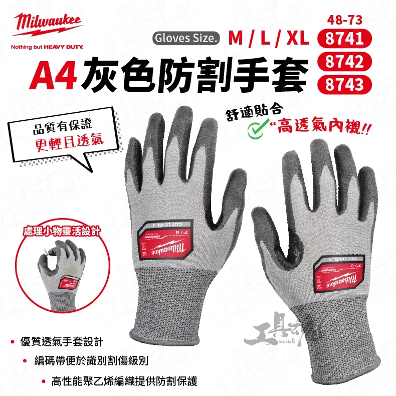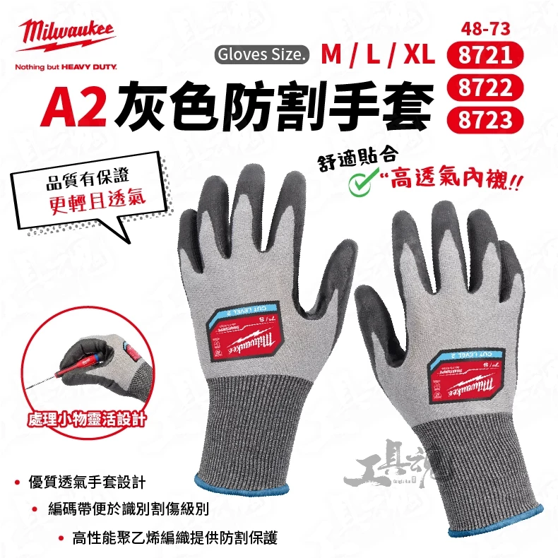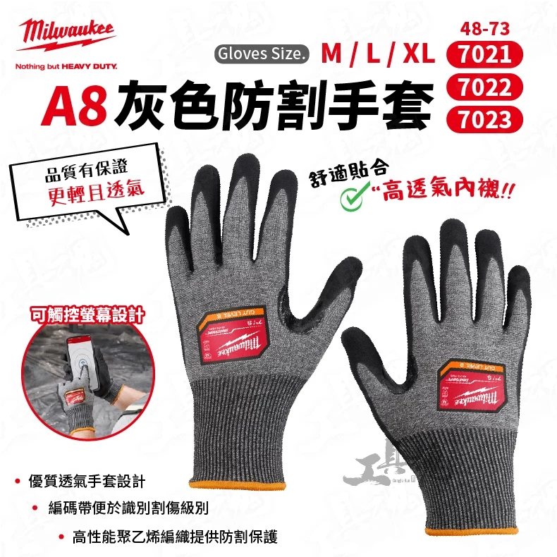 美沃奇- A8灰色防割手套 48-73-7021 48-73-7022 48-73-7023 防撞