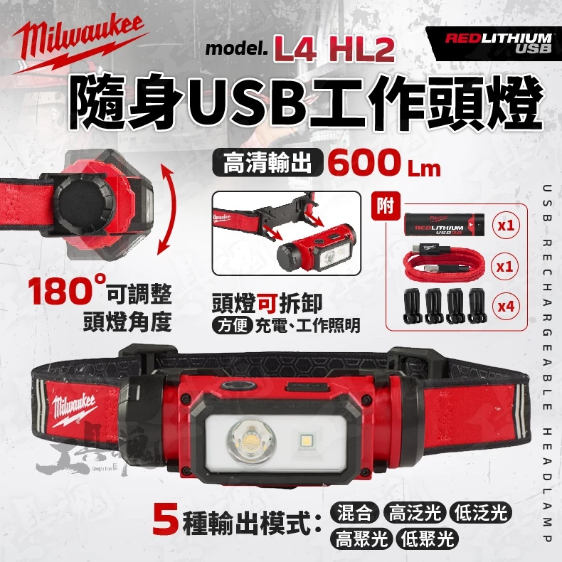 美沃奇- L4 HL2 隨身 USB 工作頭燈 600流明 頭燈 充電式 快拆式 工作燈 安全帽頭燈