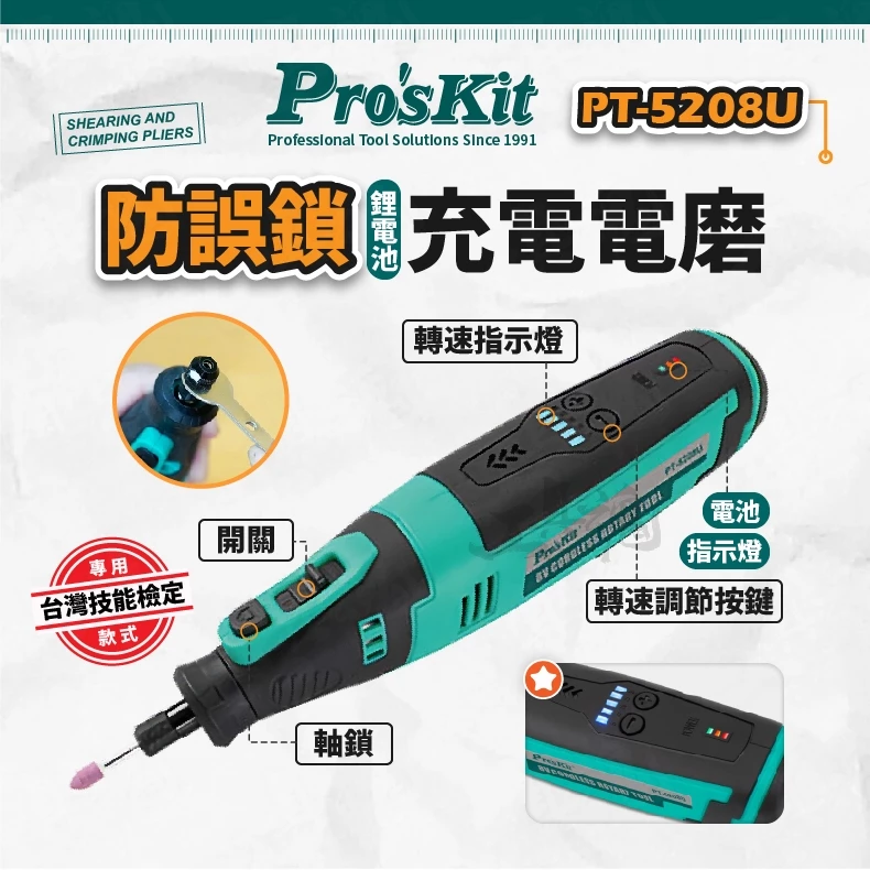寶工- PT-5208U 防誤鎖鋰電池充電電磨 ProsKit USB充電電磨組 拋光 雕刻機 電磨