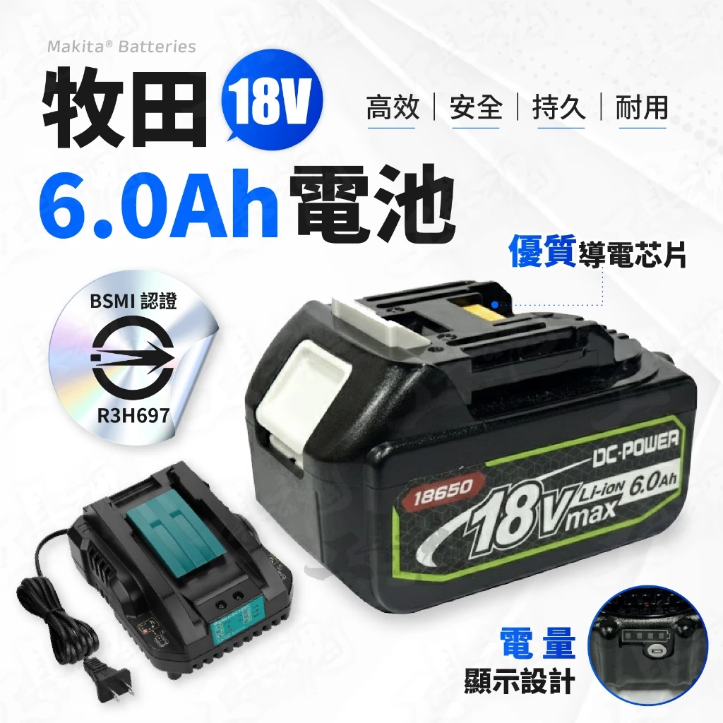 牧田- 6.0Ah 進口高倍率電芯 鋰電池 18V 副廠電池 電顯設計 牧田 電池保護 Makita